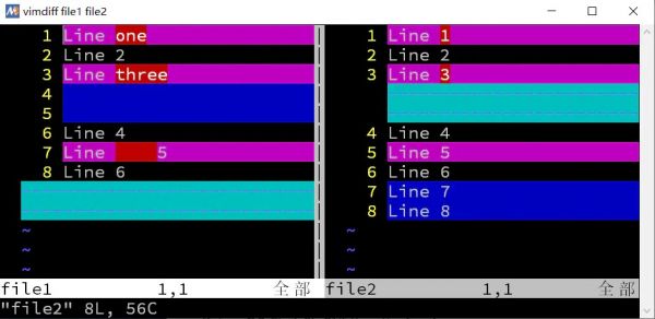 该命令通常后跟两个或多个文件名作为参数。这些文件会同时在Vim编辑器的拆分窗口中打开,不同内容的部分会高亮显示。