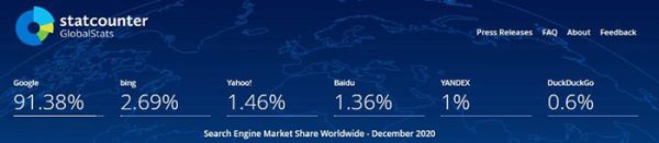 2020年全球搜索市场份额排名第一,毫无悬念。谷歌搜索仍然占据全球搜索市场份额的91.38%,领先全球搜索市场,排名第一。