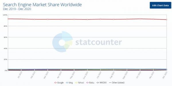 根据杰哥关于2020年全球搜索引擎市场份额的搜索数据发现: