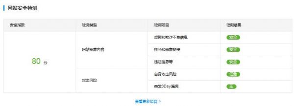 第四个数据是对整个网站以及网站是否存在漏洞攻击风险的全面安全测试。数据显示,目前卢松松博客的安全指数为80分。
