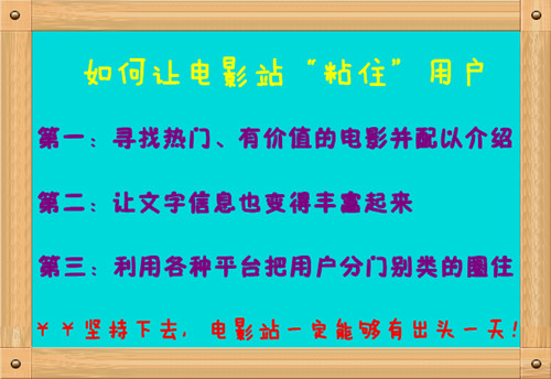 很多电影网站为什么不能很好地粘住用户呢?一个简单的解释就能说明一切:不懂得圈住用户。作为一个普通电影站,我们很难做到让用户记住我们的网站名 称或者域名,因此很多时候,用户在你的网站上看完电影后离开,以后就很难再回来这个网站了,因此利用某些平台圈住用户是很重要的。这里的平台可以是:QQ 群、微博、论坛等等这些分享型的平台,例如,我们还可以根据用户对电影的喜爱类型来让用户加群,比如一些用户喜欢看恐怖片,我们就专门建设一个恐怖电影的 qq群或者站内论坛,提供同好的用户来交流,并且通过公告来告诉这些用户,我们的网站又推出新的、热门的电影了。虽然这样做要耗费很大的人力物力,但是这 样的投入是能获得很大的回报的,用户群体一旦建立起来,那么你的网站就不怕没有流量,你也能获得大量的忠实的用户。