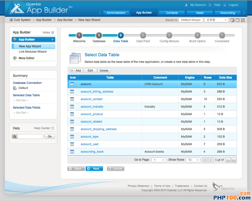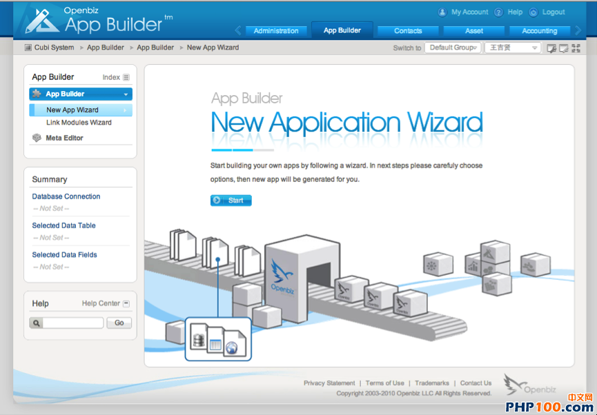 开箱体验!我们终于看到 Openbiz Appbuilder 的真面目,似乎没有我们想想的那么高深莫测,看起开图形感很强,很容易上手。主要包括了 新应用创建向导、模块连接向导 和 元数据可视化编辑器。