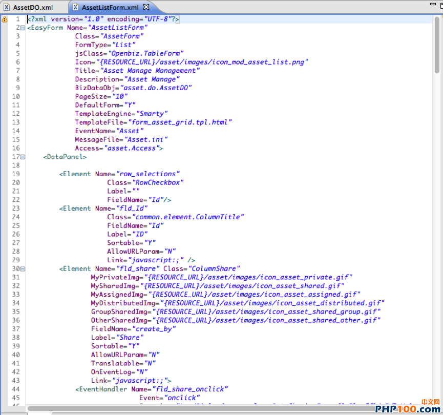 再看看生产出来的代码如何,这个应用程序的代码90%以上的都是纯XML描述文件,(Openbiz称其为 Metadata元数据)。代码结构十分轻量,而且都是直观易懂的关系应设描述,就算不用专业学习Openbiz 框架也足可以照猫画虎的上手修改一番。