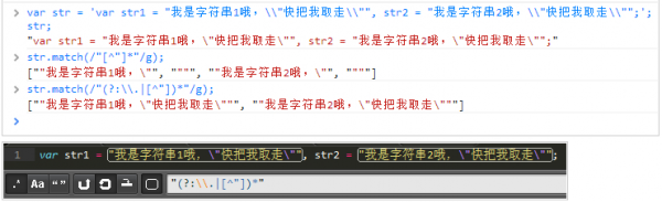很有可能针对正则表达式不了解的盆友,一下子从 /"[^"]*"/g 变到 /"(?:\\.|[^"])*"/g 后了解不上,我简易表明下。