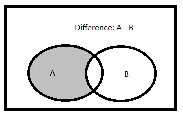 差集:2个结合(记为结合A和结合B)的由归属于结合A,但不属于结合B的全部元素组成的结合。