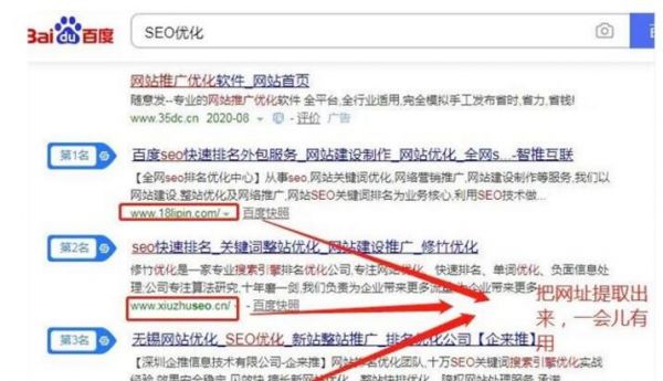开启百度搜索以SEO提升为例子,键入SEO提升。把前2页关键字排名的同行业网址记下来,巴郎这儿只演试3个。