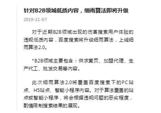 百度细雨算法2.0,针对B2B领域“低质内容”,如:供求黄页、加盟代理、生产代工、批发交易等行业。此次“雷霆”整治,覆盖百度搜索下的PC站点、H5站点、智能小程序,根据违规问题的恶劣程度,限制搜索结果的展现。