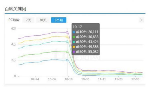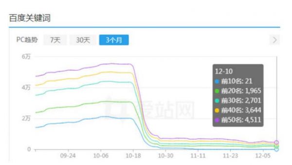 2019年11月7日,站长平台发布称,近期陆续上线细雨算法2.0。山雨欲来风满楼,这不就有人已经躺枪,见图片:10月17日,该加盟网站关键词前10名数量达20111个,前50名数量达55082个;而,后面一周关键词排名数量暴跌,直到今日,前10名数量达21个,前50名数量达4511个。