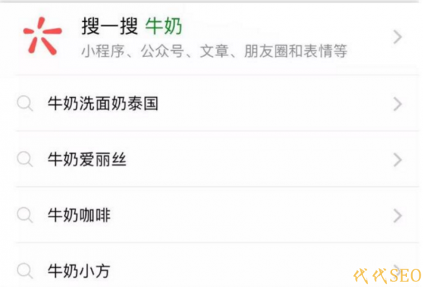 那么当用户在微信上搜索一个他感兴趣的关键词时,带有我们产品信息的公众号文章、小程序等展现在搜索结果靠前的位置,这就是微信SEO。