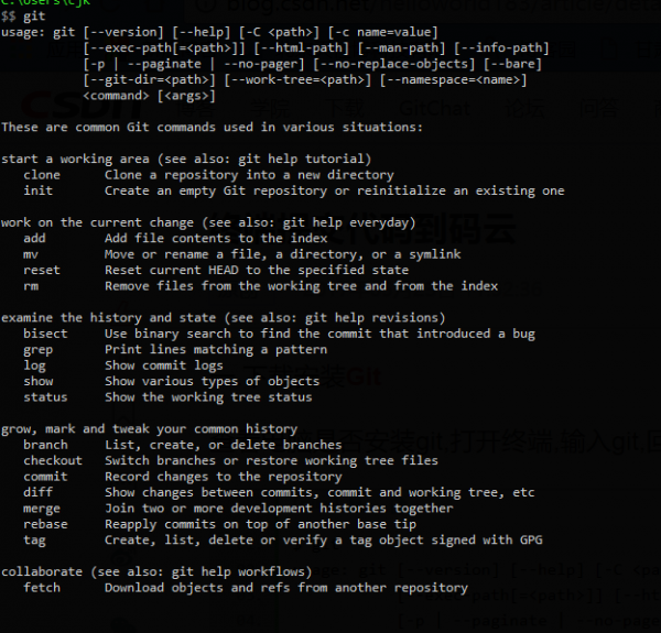 查看电脑是否安装git,打开终端,输入git,回车如果输出如下,则代表已安装了git