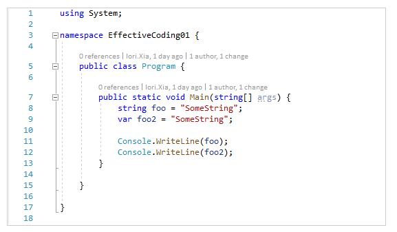 隐式类型转换为上述代码带来了良好的可读性,任何一名开发人员都会知道第2行代码的var的类型,它让我们更加的关注代码片段中我们所需要关注的部分,而不是把重点放在它的类型上。因为大多数时候,这都是没有意义的。