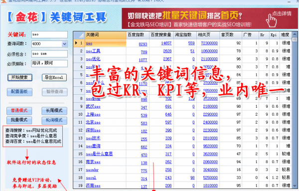 金花关键词工具是一款批量查询关键词工具,推出以后收到很多草根seo站长的喜爱。该关键词工具集众多功能与一身,包含百度指数、关键词、百度索引量、长尾词模式,批量模式等等。