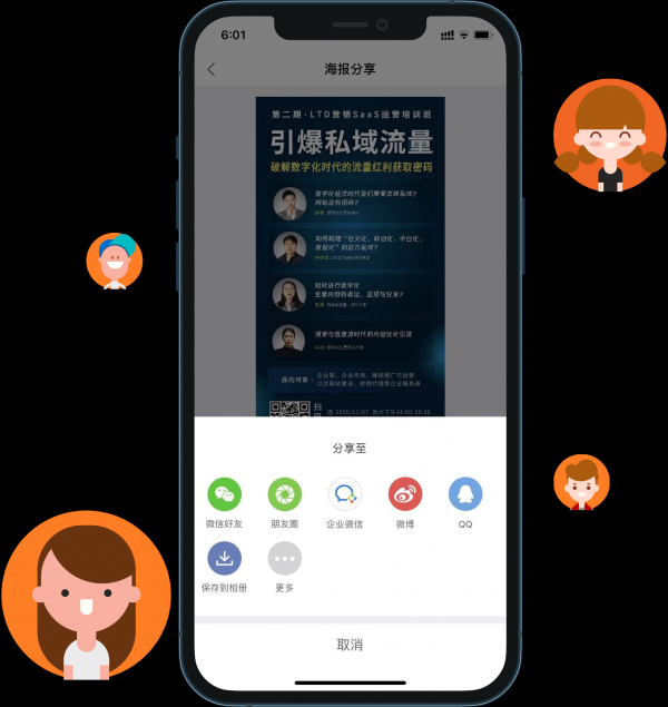 图片、视频、文章、海报等素材可以共享,支持各种链接的生成,裂变共享,客户几何增长,共享记录,有针对性的回访客户,信息收集,增强互动。
