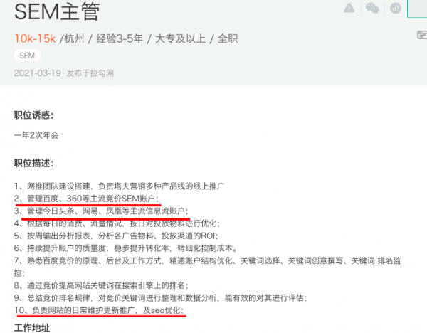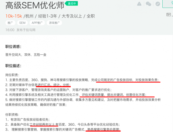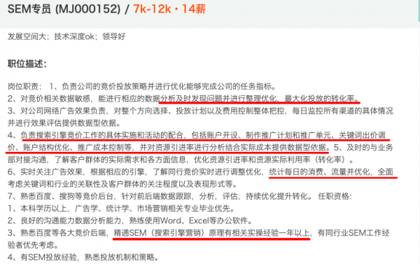 SEM主要做什么,需要什么技能?最快知道的方法就是去招聘网站了解不同行业对SEM竞价的要求。白杨SEO带拉古。例如。