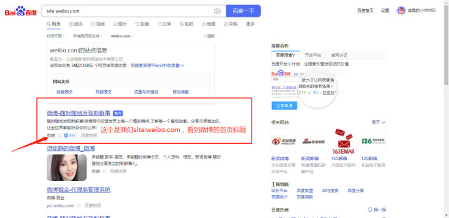 这时我们可以看到,在搜索全称的时候,微博的首页也出现在了第一位。如果能在第一时间搜索到完整的标题,说明网站参与了排名,但只说了排名的好坏。