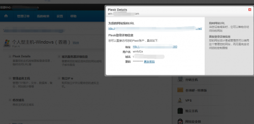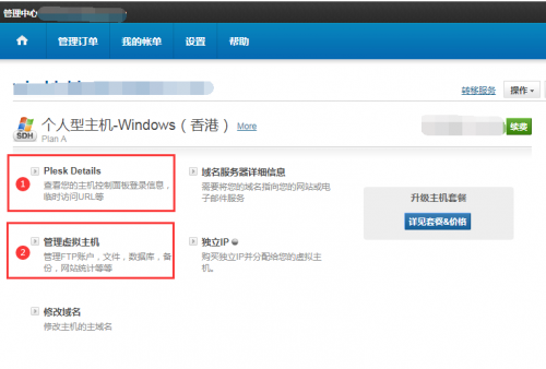 3、在管理页面,可以直接点击“管理虚拟主机”进入Plesk控制面板,或者点击Plesk Details,再点击控制面板的链接,如下图;