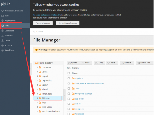 4、进入Windows虚拟主机的控制面板之后,找到httpdocs文件夹,这个地方与Linux是有区别的,大家需要注意;