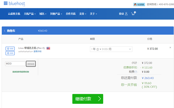 选择Windows系统的虚拟主机,由于只是建个博客站,我选择的就是PlanA方案,优惠码MDD有7折优惠;联系他们的客服能获得一个免费的域名。