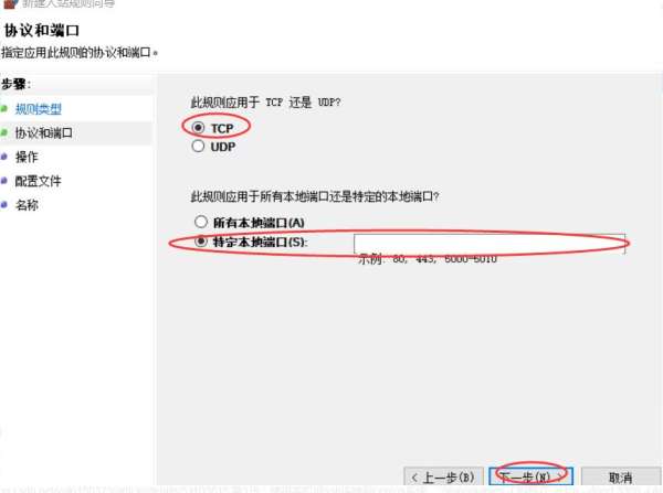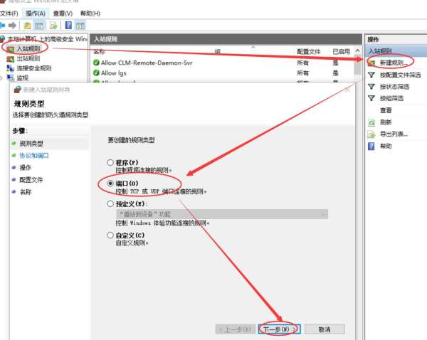 选择左边入站规则,右边新建规则,然后在弹出界面选择端口,进行下一步,规则一般应用于TCP,选择特定本地端口,输入你要允许通过的端口号。