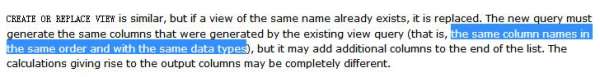 究其原因,是PostgreSQL虽然支持CREATE OR REPLACE VIEW语义,却有着容易让人忽略的重要限制(Oracle没有该限制),其官方文档这样描述: