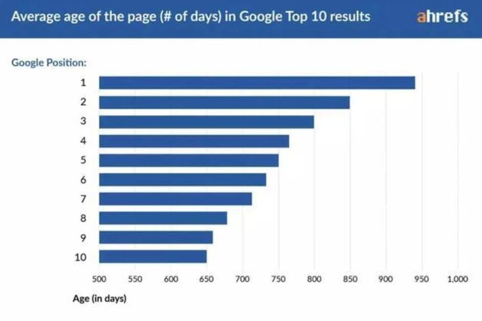 Ahrefs Blog 就做了谷歌排名前10的网站制作时间的调查: